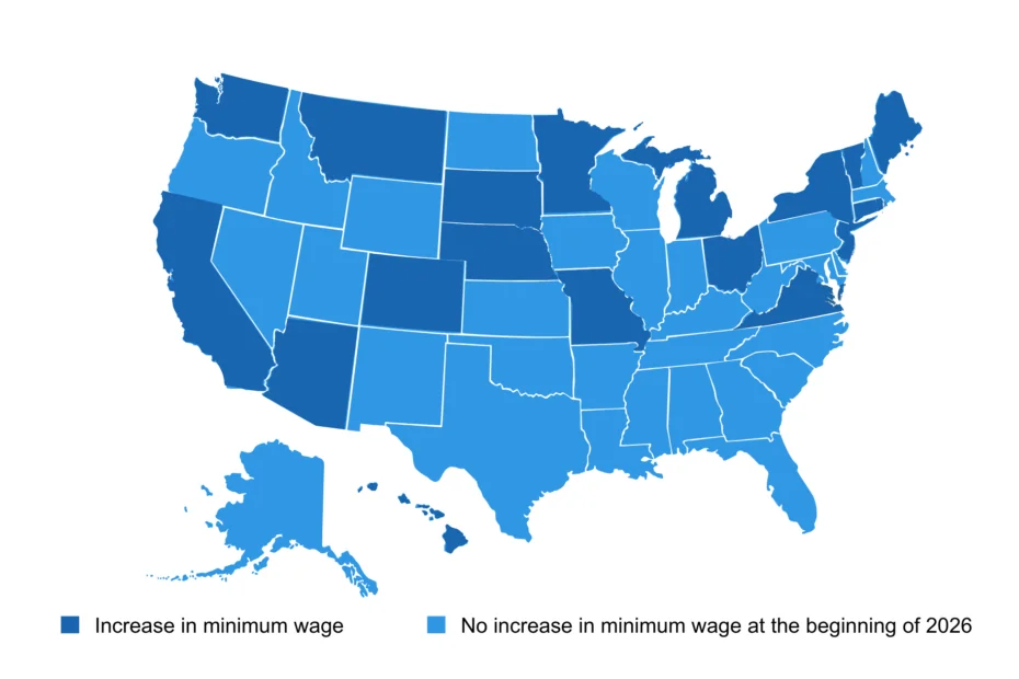 Effective January 1, 2026, numerous states implemented automatic or legislated minimum wage increases. Below is a snapshot of several notable changes: